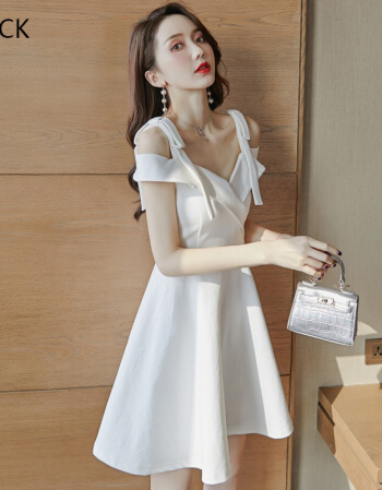 KM CK 宴会气质平时可穿显瘦吊带一字肩连衣裙白色小晚礼服
